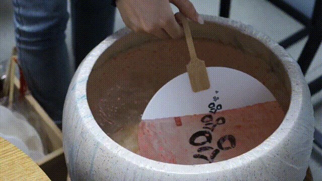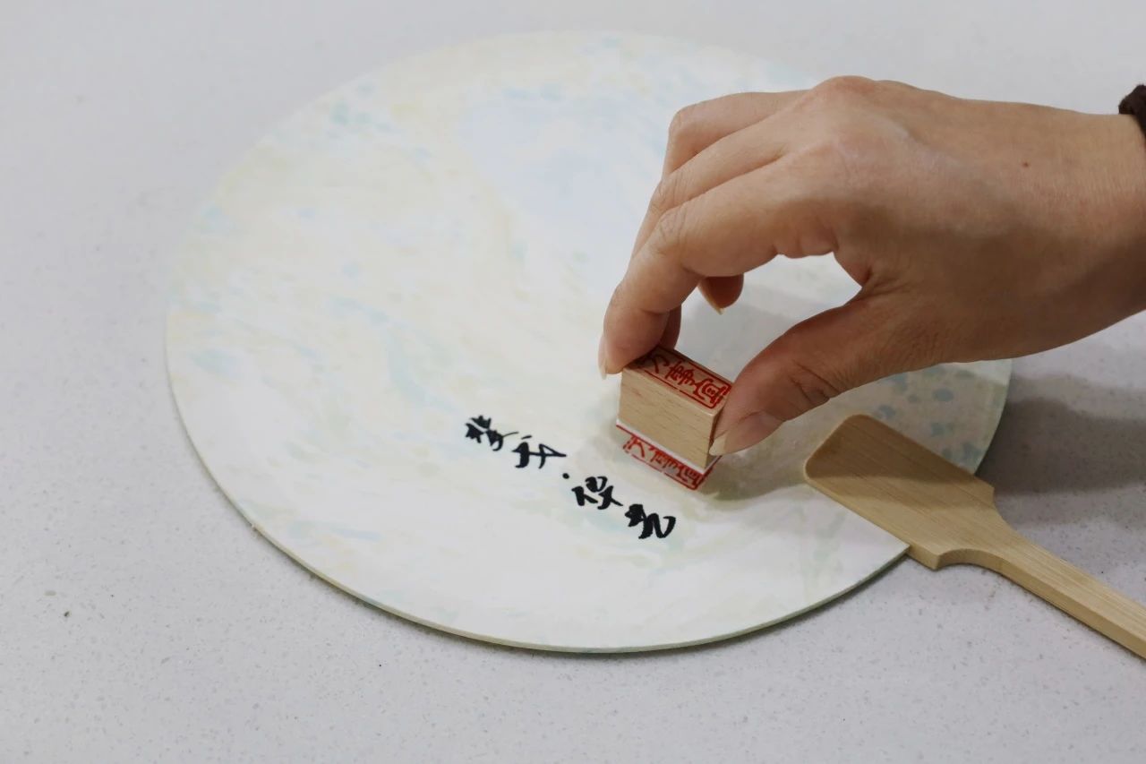 漆扇的制作工藝中包括了“漂漆”技法,這種技法利用了漆不溶于水的特質(zhì),彩漆漂在水面上形成發(fā)散的色塊,極具生命感和隨機(jī)性。